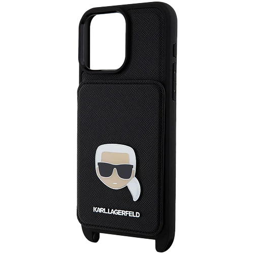 Lagerfeld для iPhone 15 Pro Max чехол Crossbody cardslot PU Saffiano Metal Karl Head Hard Black
