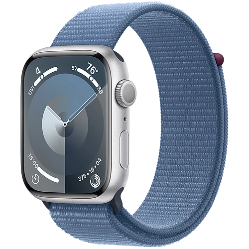 Apple Watch Series 9 GPS, 45 мм, корпус - серебристый, спортивный нейлоновый ремешок синего цвета
